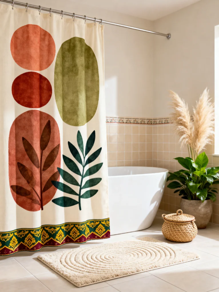 The rest of the room stays very quiet to let the curtain do the talking. The cream tiles and the simple white tub create a blank canvas. To add some life, there’s a large potted plant and some tall, feathery pampas grass. Texture is key here—look at that bath mat! The concentric circle pattern mimics the shapes on the curtain, which is a very subtle but effective design trick. This look is perfect if you want something that feels modern and “designed” but still very calm and easy on the eyes.