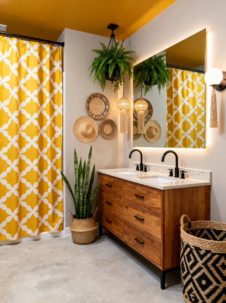 Yellow is such an underrated color for bathrooms, and this “Sunny Geometry” look shows why we should use it more. That bright yellow patterned shower curtain instantly makes the room feel ten degrees warmer and significantly happier.