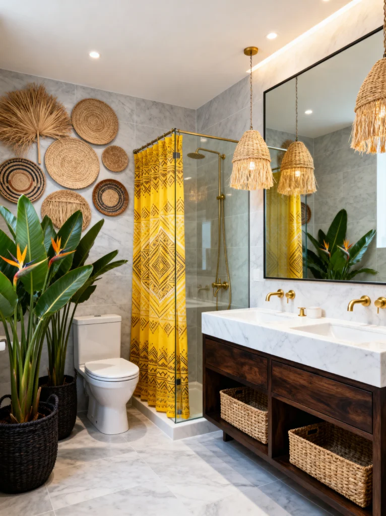 This is what happens when luxury meets a bohemian soul. It’s got all the “must-haves” of a high-end bathroom—marble walls, gold hardware, and a double vanity—but it stays relaxed thanks to the decor. The mustard-yellow tribal print shower curtain is a bold choice that pays off beautifully against the gray marble.