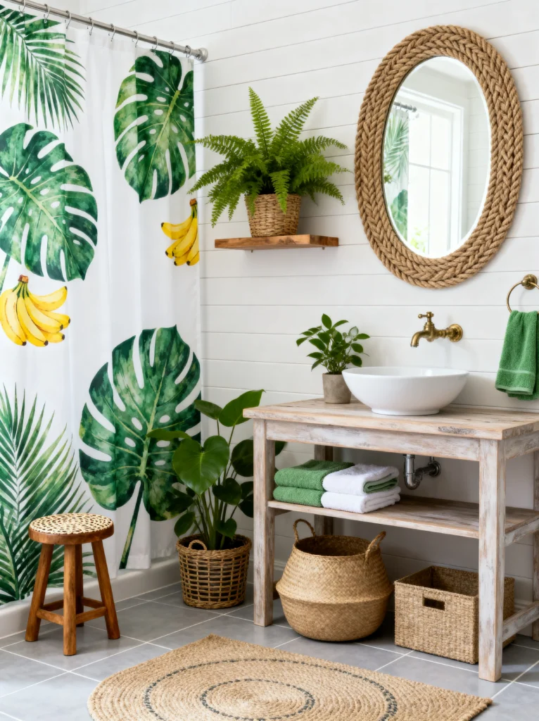 Ready for some jungle vibes? This “Tropical Punch” look is so refreshing. The oversized Monstera leaf and banana print on the shower curtain is the ultimate statement piece. If you can’t keep real plants alive, a bold botanical print like this is the next best thing!