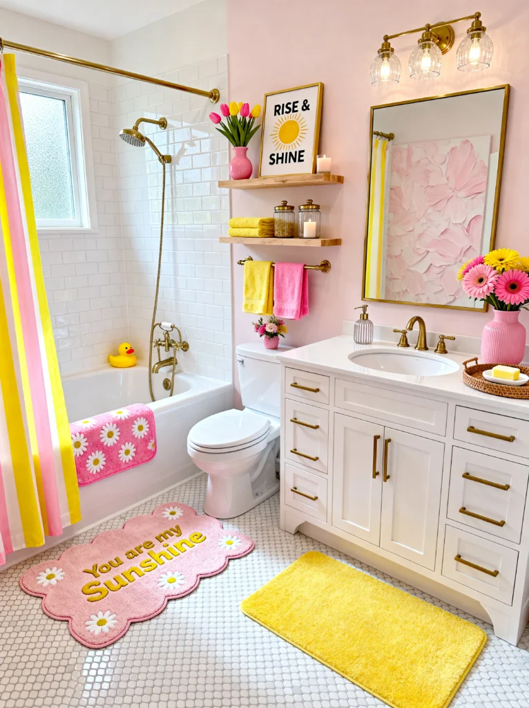 Last but certainly not least, we have this adorable “Retro Sunshine” setup. This is pure happiness in room form. The pink, yellow, and white striped shower curtain sets a playful, vintage-inspired tone that carries through the whole space.