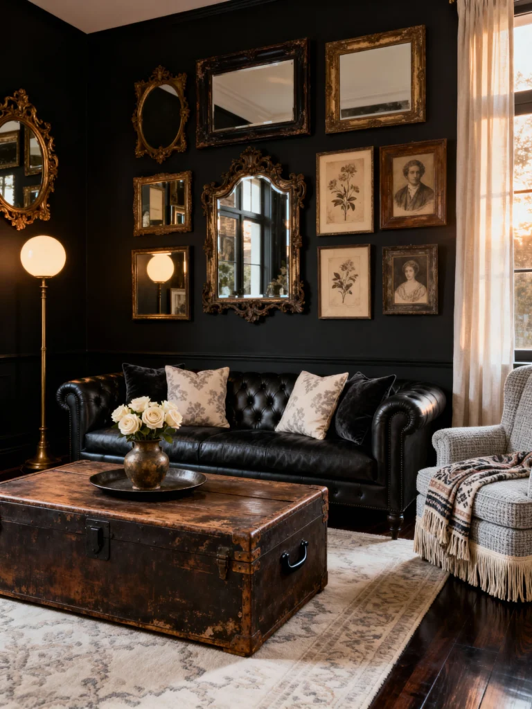 Can we just take a second for this gallery wall? If you love a room that feels like it has a hundred stories to tell, this is it. By pairing a tufted black leather sofa against matte black walls, the furniture almost melts into the room, letting those ornate gold mirrors and vintage portraits really pop. It’s moody, it’s sophisticated, and it feels like a cozy library in a hidden mansion. To keep it from feeling too heavy, that cream rug and the soft glow of the globe lamp do a lot of heavy lifting.