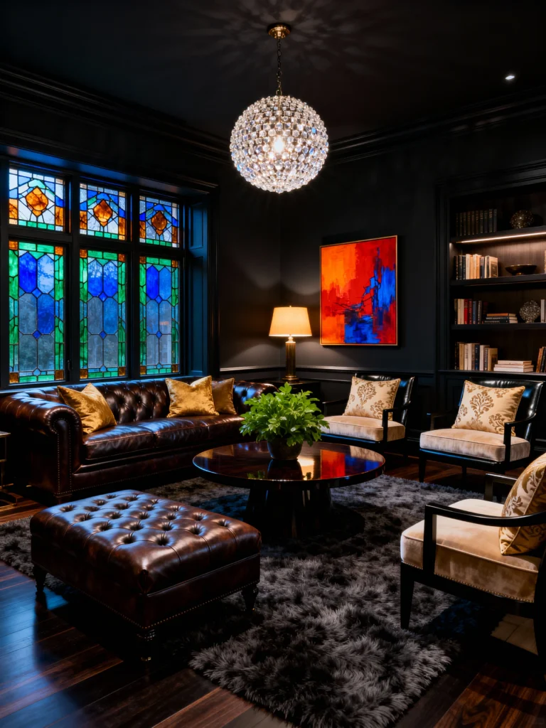 Finally, we have this stunning den. It’s dark, it’s plush, and that stained-glass window is the absolute star of the show. The deep brown leather sofa and the shaggy grey rug create so much physical warmth. It’s a masterclass in lighting—using a crystal chandelier and a warm floor lamp to create pockets of light in a dark room makes the space feel intimate rather than small.