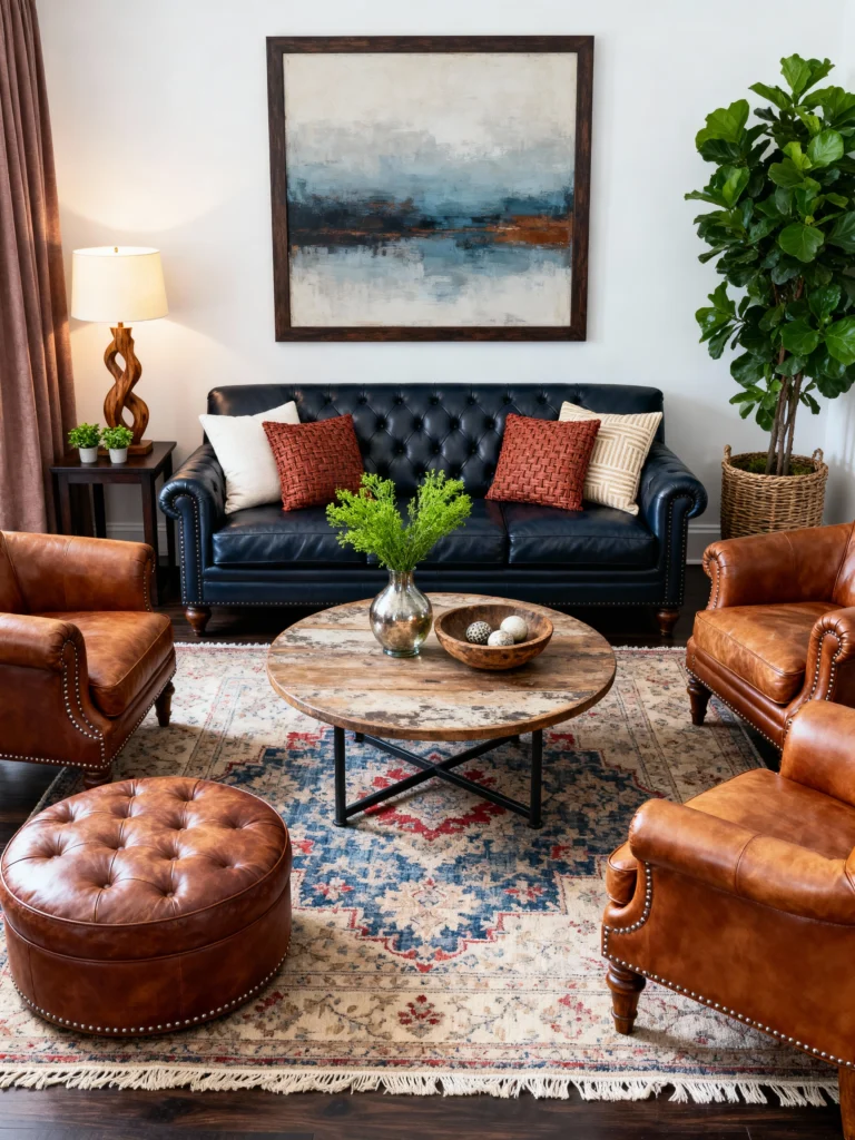 If you’re worried a black sofa feels too “modern,” look at this leather Chesterfield. It’s surrounded by warm wood tones and rich cognac leather armchairs, which instantly makes the room feel approachable and lived-in. I love how the rug ties the blues and reds together, making the black sofa feel like a natural part of the family rather than a standout piece. It’s the perfect spot for a long Sunday chat with a cup of coffee.