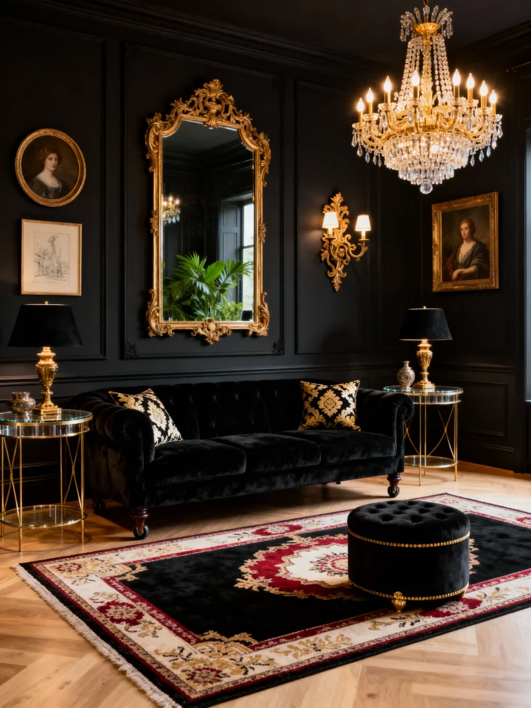Okay, this one is for the drama seekers! This velvet sofa is pure luxury. When you mix black velvet with high-shine gold accents—like that incredible chandelier and those side tables—you get a look that’s “Old World Glamour” through and through. The trick here is the symmetry and the herringbone floors; they keep the room feeling structured and intentional. It’s bold, sure, but man, does it make a statement.