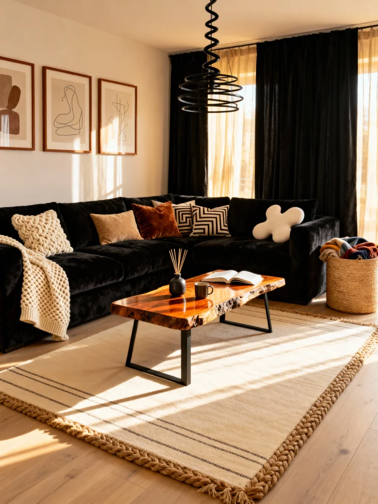 This is proof that black sofas can be incredibly cozy. The “secret sauce” here is texture. You’ve got a chunky knit throw, a live-edge wood coffee table, and a rug with that beautiful braided border. The sunlight hitting those warm pillows makes the whole space feel inviting rather than cold. It’s a great example of using “earthy” elements to soften the visual weight of a dark sectional.