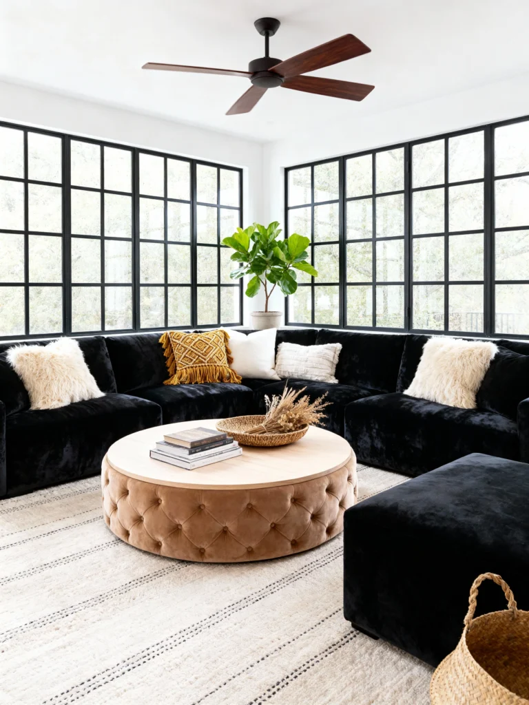 I love this look because it flips the script. Instead of dark walls, we have massive windows and bright white paint. The black sectional acts as a visual anchor in a room that might otherwise feel like it’s floating away. That tufted tan ottoman in the center is a genius move—it bridges the gap between the dark sofa and the light floor. It feels fresh, clean, and totally modern.