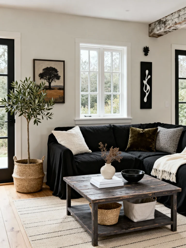 This is “California Cool” at its best. The sofa here has a more relaxed, slipcovered vibe, which takes away any stiffness. When you pair black furniture with light oak floors and a simple olive tree, the whole room feels peaceful. It’s not trying too hard, and that’s exactly why it works. It’s the kind of space where you can actually kick your shoes off.