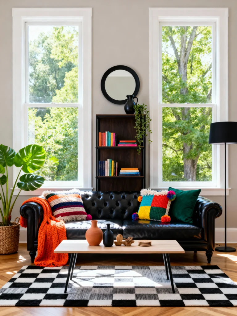 Who says black has to be serious? This room is such a blast! The black leather sofa serves as the perfect neutral backdrop for those vibrant, multi-colored pillows and that bright orange throw. The checkered rug adds a fun, retro energy that ties it all together. If you have a colorful personality, a black sofa is actually your best friend because it makes every other color look more vivid.