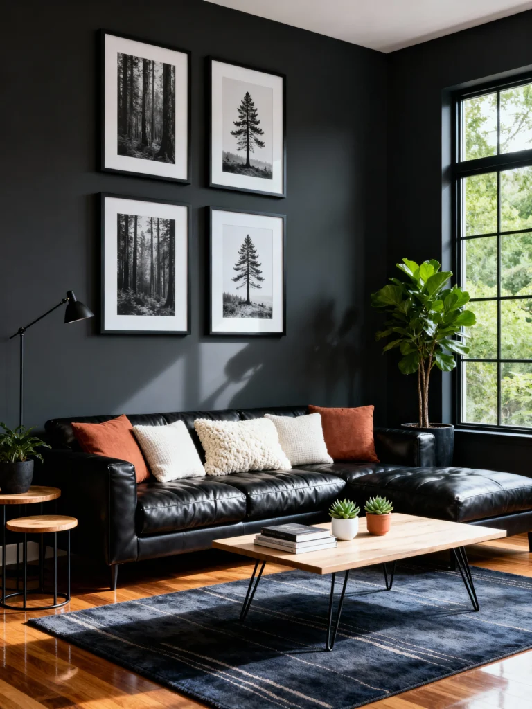 This setup screams “cool city apartment.” The low-profile leather sectional paired with the dark charcoal walls creates a very seamless, architectural look. I’m a huge fan of the pops of terracotta in the pillows—it adds just enough warmth to keep the room from feeling chilly. The black-and-white forest photography on the wall adds a nice vertical element that makes the ceilings feel miles high.