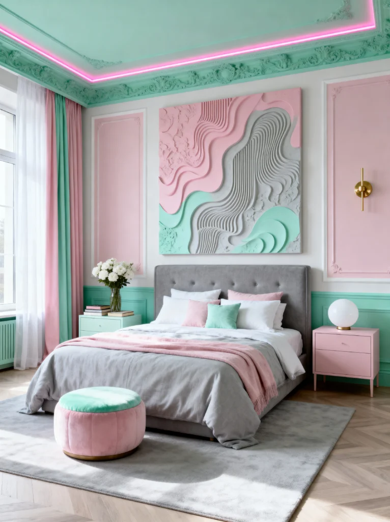 Can we just take a second to appreciate this mint and pink perfection? This room feels like a breath of fresh air. If you’re a fan of that “Grandmillennial” look but want to keep it feeling modern and sharp, this is exactly how you do it. The star of the show has to be that incredible 3D textured wall art. It pulls in those wavy, organic shapes that are so trendy right now, but the way it mimics the colors of the room—that soft blush and cool mint—makes the whole space feel intentionally curated.