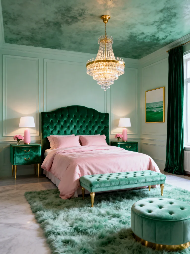 That deep emerald green tufted headboard is the perfect “anchor” for the room, and the soft pink bedding keeps the whole look sweet and light. I’m also a huge fan of the “shaggy” mint rug—it looks so soft to walk on! The crystal chandelier adds that final touch of sparkle. This room is proof that you can use a lot of one color (mint) and as long as you vary the shades and textures, it looks absolutely stunning. It’s peaceful, stylish, and so, so pretty.