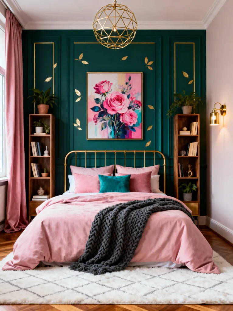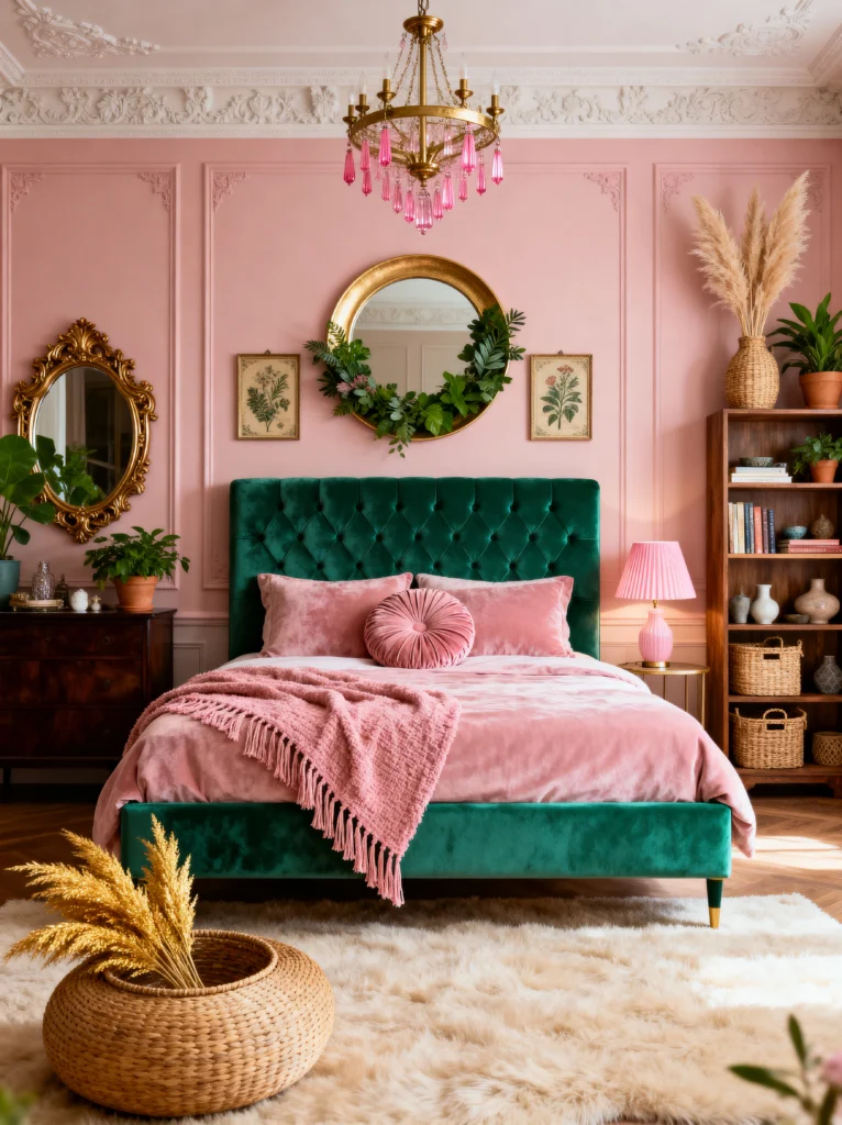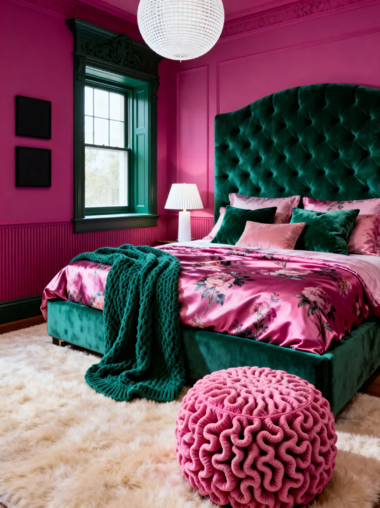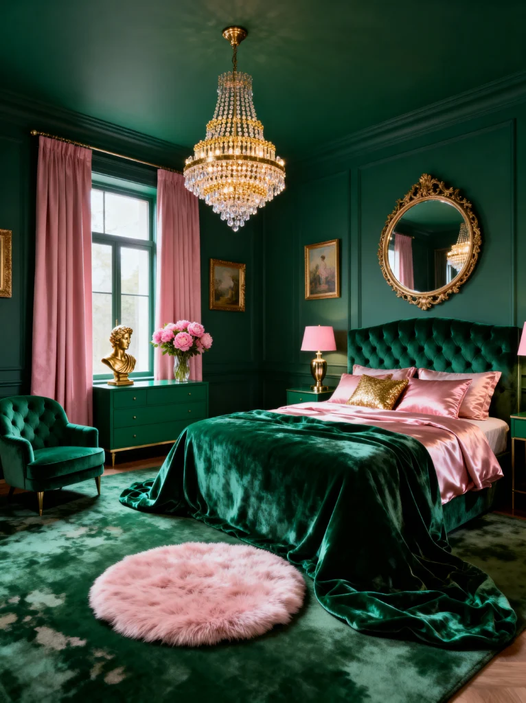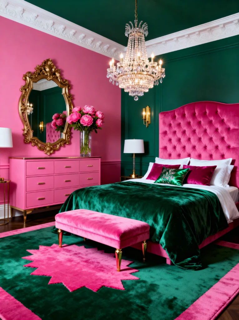 This room is not for the faint of heart, and that’s why I love it! It is unapologetically bold. We’ve got these saturated magenta walls that just scream confidence. When you pair a color that bright with a deep, emerald green velvet bed, you get a high-contrast look that feels very “Maximalist Chic.”