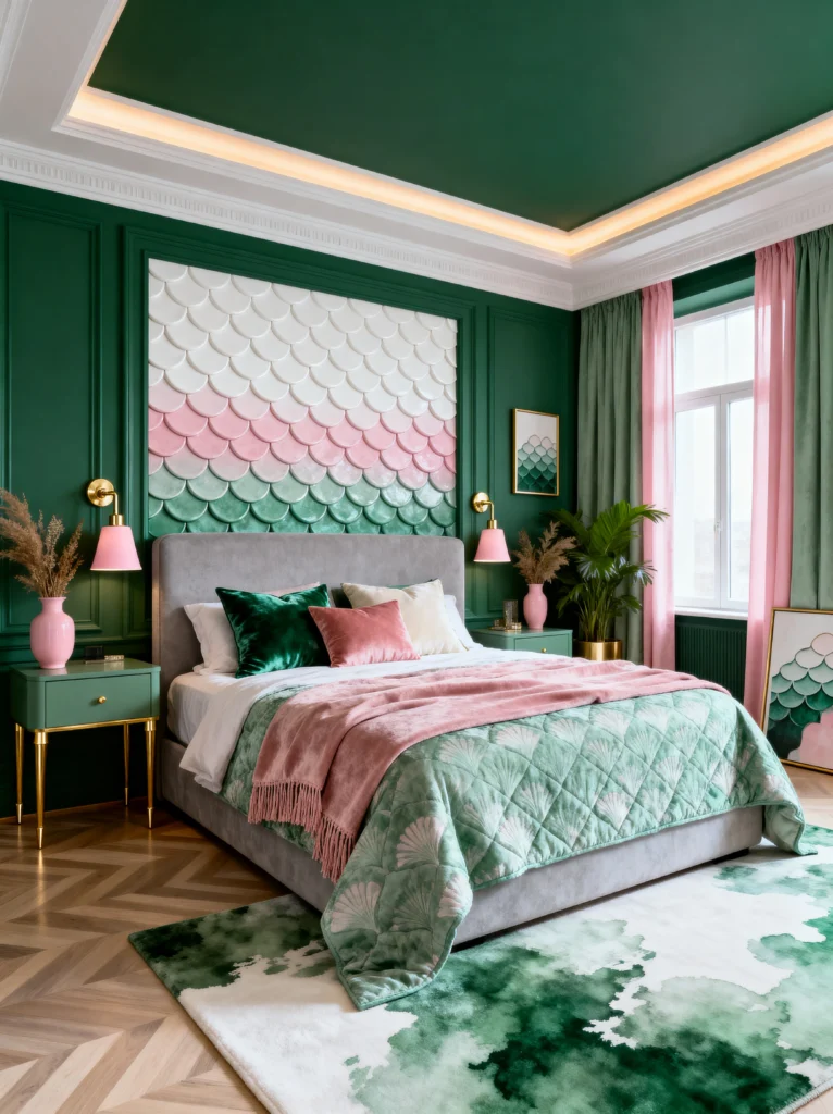 This one is for my fans of texture. The first thing you notice is that incredible scalloped feature wall behind the headboard. It looks like mermaid scales but in a sophisticated, architectural way, transitioning from white to pink to green. It’s such a clever way to bring in the color palette without just painting a flat wall.