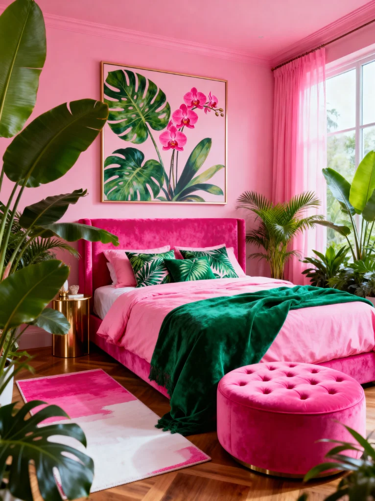 Are you ready for a vacation? Because this room feels like a permanent stay at a luxury resort in the Maldives. We are leaning heavily into the “maximalist” side of things here. The walls are a vibrant, unapologetic pink, which serves as the perfect backdrop for those massive monstera leaves and tropical plants.