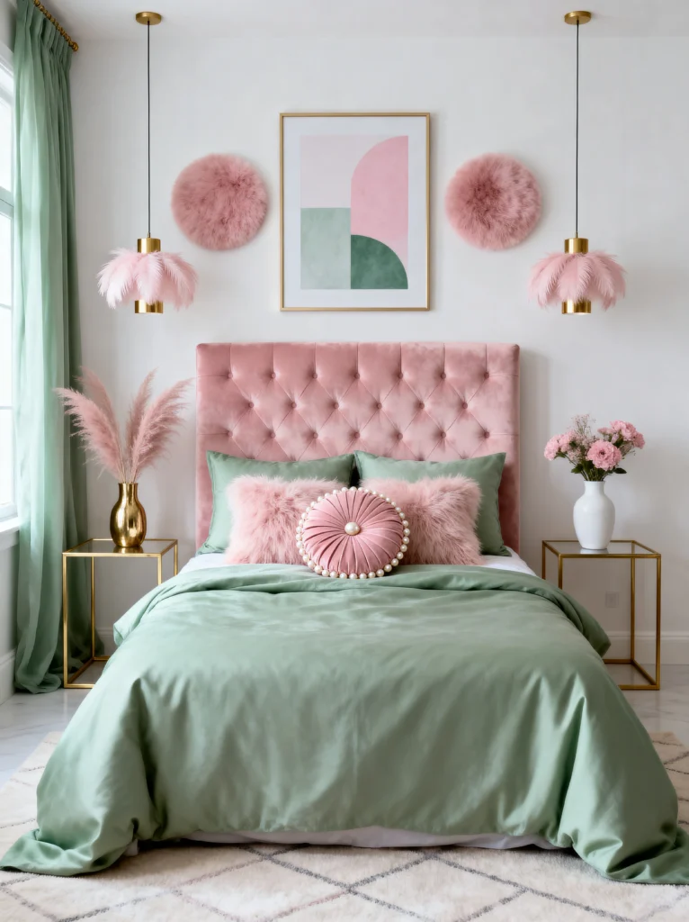 We’re taking a break from the dark greens for a second to look at this airy, minty dream. This room is all about softness. The walls are a clean, crisp white, which lets the mint green bedding and the blush pink velvet headboard really pop.