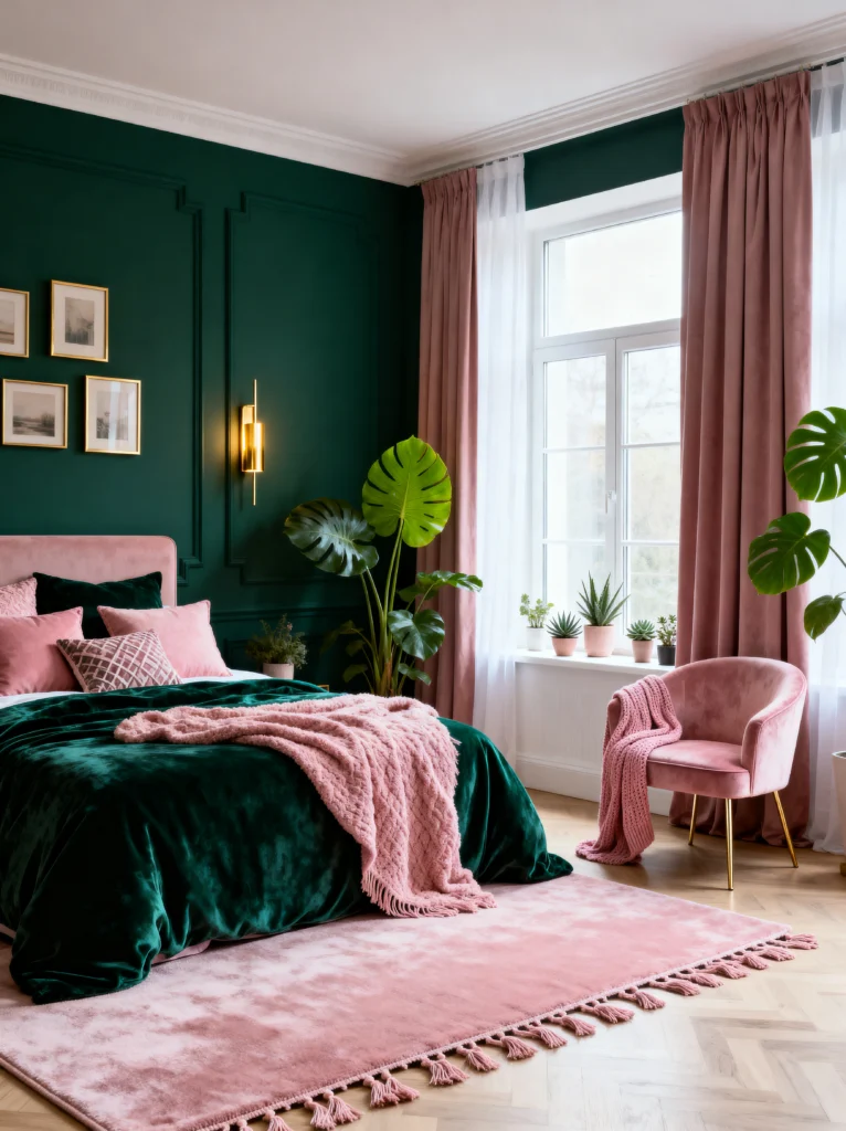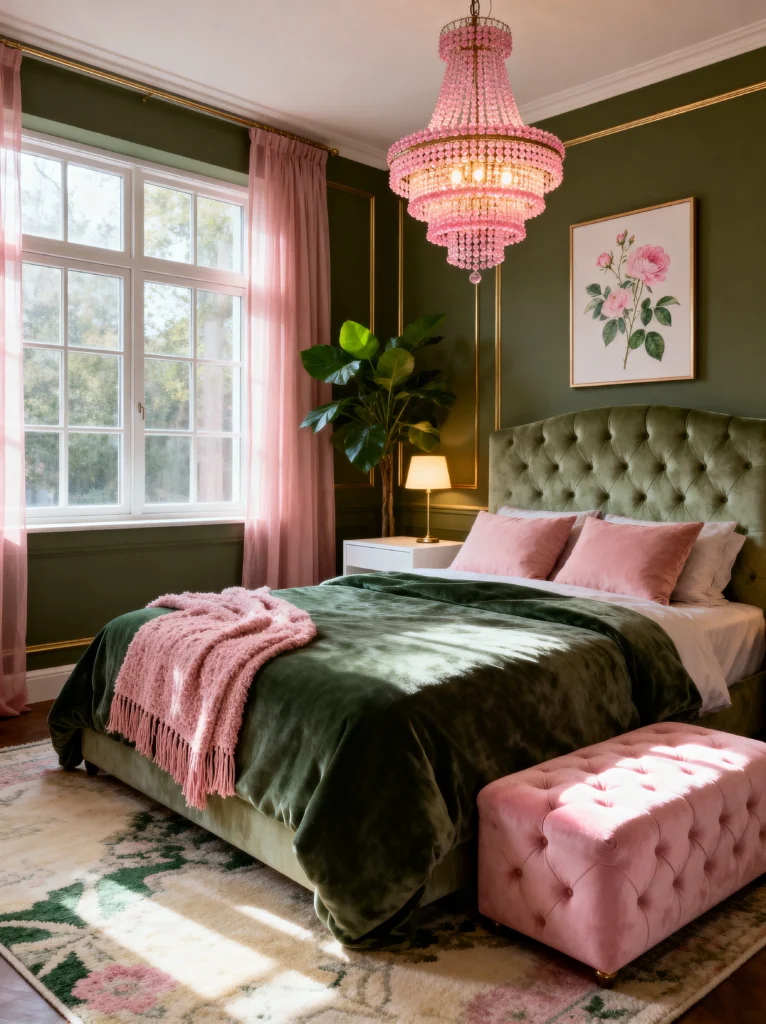 I love the mix of textures on the bed—the dark green velvet duvet topped with a chunky knit pink throw. It looks so tactile and expensive. Also, notice the plants! Adding real greenery to a green room sounds redundant, but it actually adds life and depth that paint just can’t replicate. It’s a sophisticated, grown-up way to do the pink-and-green trend.