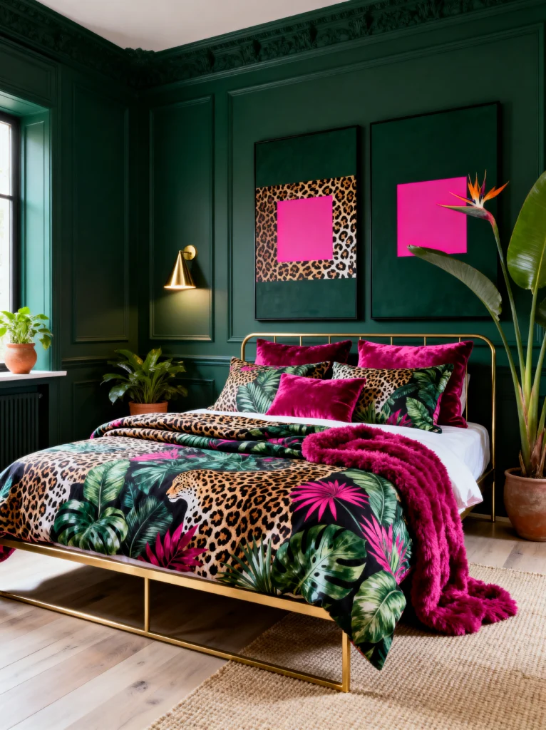 The magenta pink accents in the artwork and the fuzzy throw blanket are super saturated, matching the energy of the animal print. It’s a high-fashion look that feels very “boutique hotel.” If you want your bedroom to be a conversation starter, this is how you do it.