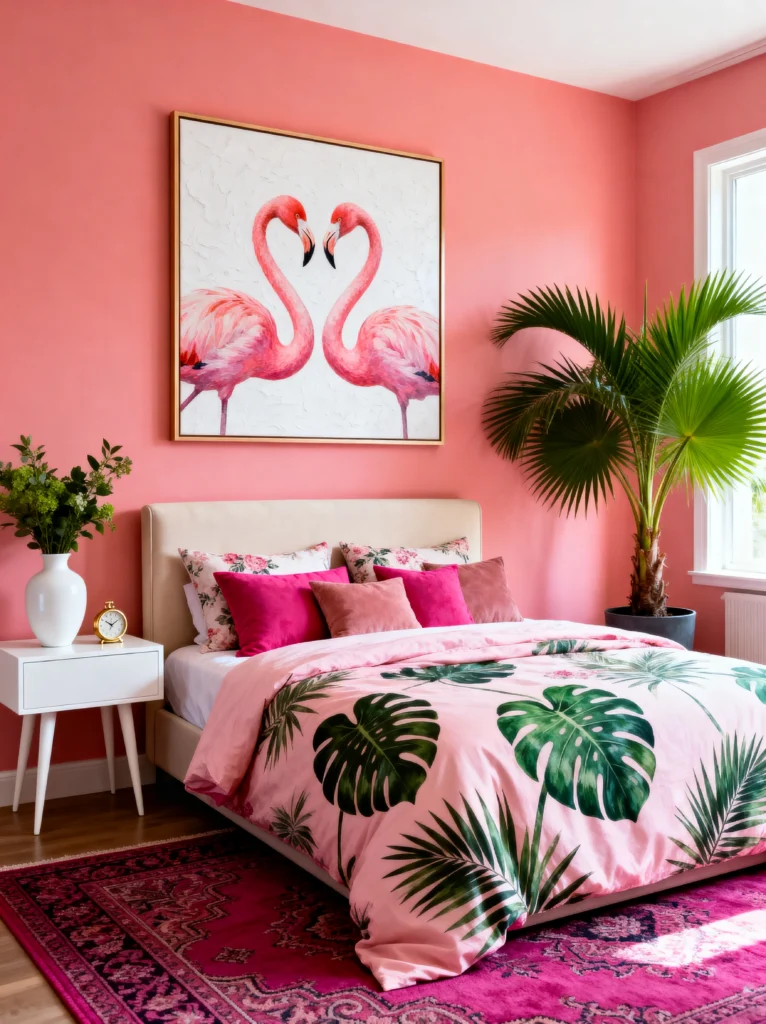 If you want to feel like you’re waking up on a permanent vacation, this is the vibe. We’re looking at a serious commitment to coral, and I am here for it! Painting the walls this warm, sunset pink makes the whole room feel like a giant hug. It’s cozy but bright. The flamingo artwork is such a classic choice for a tropical theme, but because it’s a large-scale piece, it feels like a statement rather than just “decor.”
