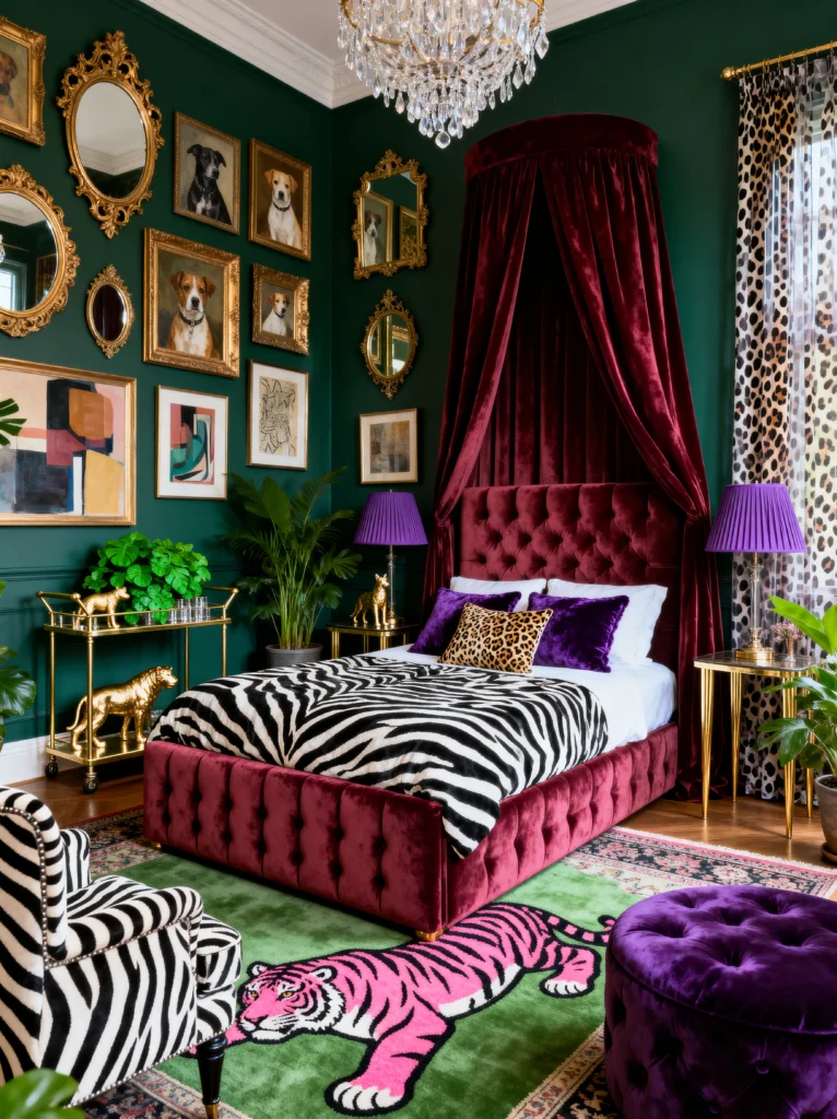 There is so much happening here: zebra print blankets, a pink tiger rug, purple lampshades, and gold leopard statues. It’s a riot of color and pattern, but because it stays within that jewel-tone family (deep green, burgundy, purple, and pink), it feels like a curated collection rather than a mess. It’s bold, brave, and 100% unique.