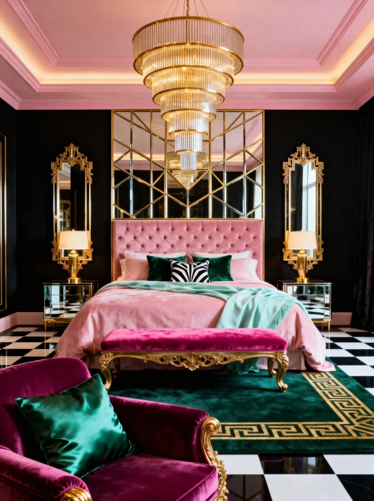 The floor is another huge statement—that black and white checkerboard is classic, but putting a deep green rug with a Greek key border on top of it? That’s a pro design move right there. It’s all about layers! The tiered gold chandelier is the perfect finishing touch. It feels very “Old Hollywood,” but the pops of mint and zebra print keep it feeling fresh and current. This is definitely the room for someone who wants their home to feel like a five-star boutique hotel every single day.