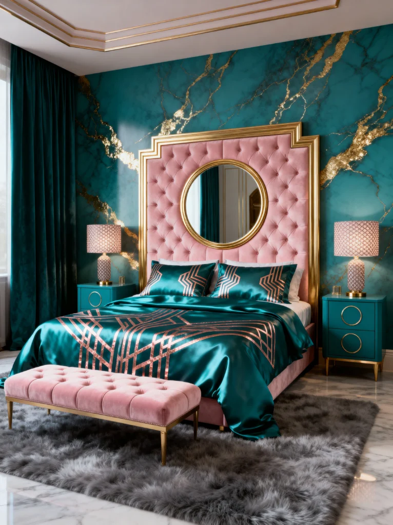 The bedding here is super sleek. That teal silk with the rose gold geometric patterns ties in perfectly with the wallpaper. By keeping the furniture—like the nightstands—in that same teal family, the room feels very cohesive. Then, you toss in the fluffy grey rug and the pink velvet bench to add some “softness” back into the space. It’s a very “cool” room, literally and figuratively. It feels sophisticated, modern, and just a little bit magical.