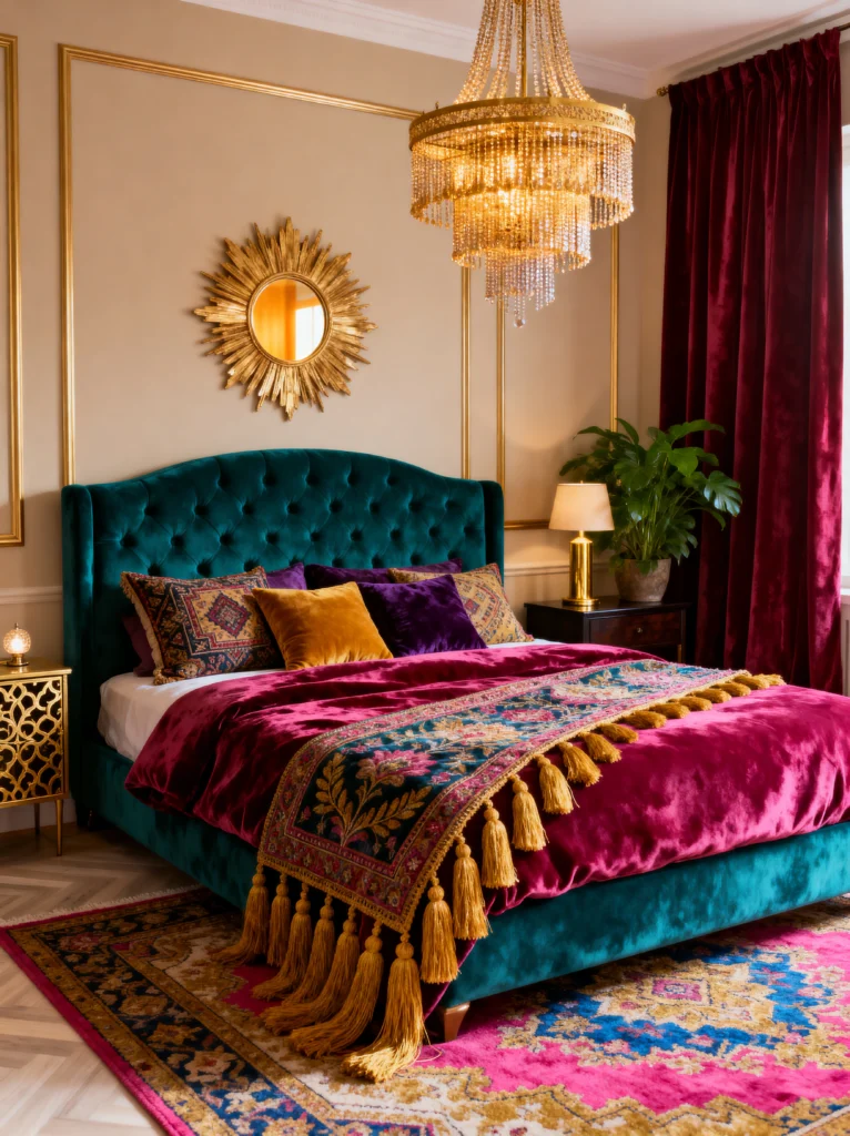 The sunburst mirror over the bed is a classic design element, and against the beige walls with gold trim, it looks like a piece of jewelry. I love how the deep teal of the bed frame is mirrored in the patterns of the rug. It’s a very warm, “weighted” room—everything feels solid and expensive. Even the bedside tables have that intricate gold fretwork! This is a great example of using “Traditional” shapes (like the chandelier and the molding) but making them feel exciting with a really bold, jewel-toned color palette.