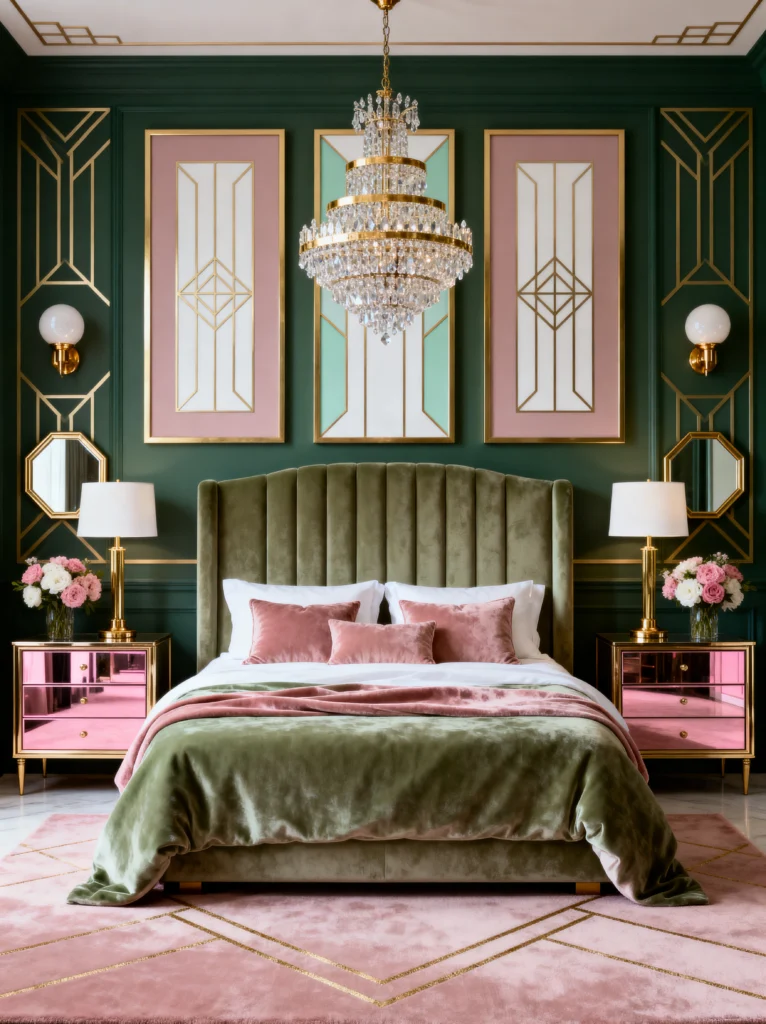 This room is so symmetrical and satisfying to look at! It’s another great take on Art Deco style but with a softer, more “Spring” color palette. The deep emerald green walls are broken up by those beautiful pink and mint panels with gold geometric lines. It gives the room so much height and structure.