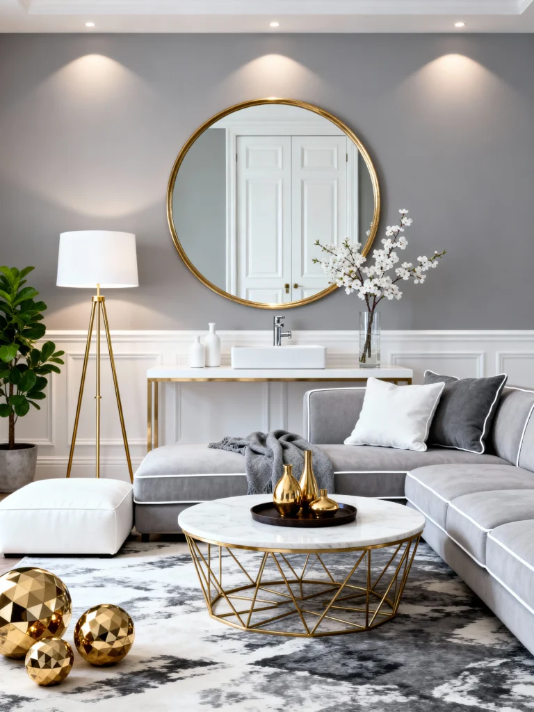 Finally, we have this stunning, bright setup. The round gold mirror is a total showstopper and reflects so much light back into the room. The marble coffee table with the gold base matches the mirror perfectly, creating a very cohesive, “designed” look. I love the little gold geometric spheres on the rug—they’re like jewelry for your floor! This room feels bright, expensive, and very “Pinterest-perfect.”