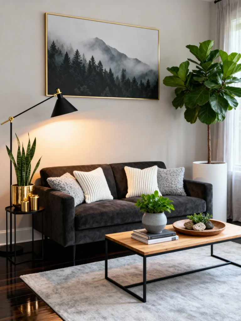 If you want something a bit more dramatic, this is it. The dark sofa against that soft gray wall creates so much depth. What really pulls me in, though, is the misty mountain artwork. It sets a quiet, peaceful tone for the whole room. Notice how the gold planter on the side table adds a tiny pop of “glam” without being overwhelming? It’s a great reminder that you can mix industrial blacks with warm golds for a super sophisticated look.