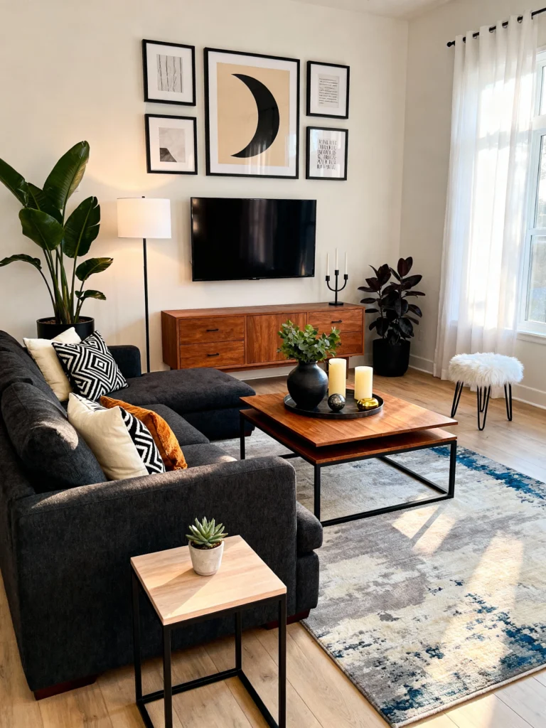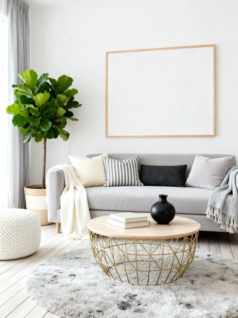 This is for my friends who love a clean, bright, and open space. The light gray sofa and the round gold wire coffee table make the room feel incredibly spacious. It’s a great trick for smaller apartments—using furniture you can see through (like that table) keeps the floor plan looking open. The oversized blank frame is actually a bold choice here; it highlights the height of the ceilings and lets the lush green plant be the star of the show.