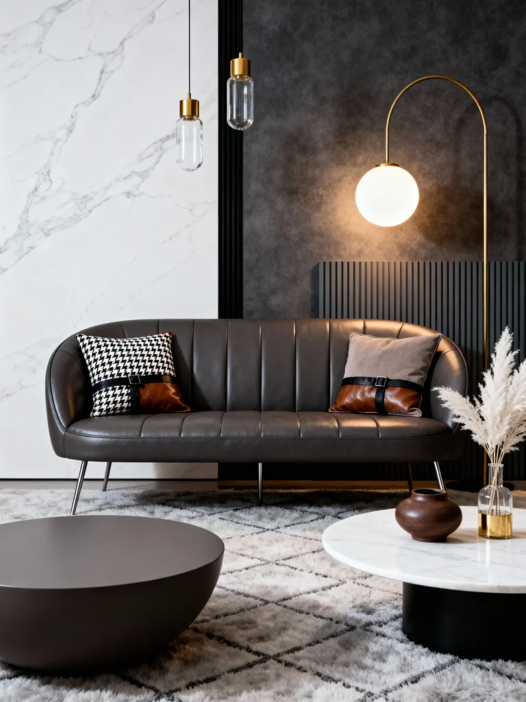 This room feels like a high-end penthouse in the city. The leather sofa with those unique buckled pillows is such a cool, “cool-girl” detail. I’m obsessed with the contrast between the white marble wall and the dark, textured accent wall. It’s edgy but still feels warm thanks to that glowing globe floor lamp. If you want a space that feels curated and artistic, play with different wall textures and sculptural lighting like you see here.