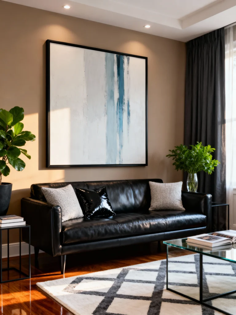 Sometimes, one big piece of art is all you need to define a room. This oversized abstract painting completely commands the space. The black leather sofa and the geometric rug keep things feeling modern and sharp. It’s a very “grown-up” space that doesn’t feel stuffy. If you have a large empty wall, don’t be afraid to go big with your art—it acts as a focal point and saves you from having to buy a bunch of smaller decorations.