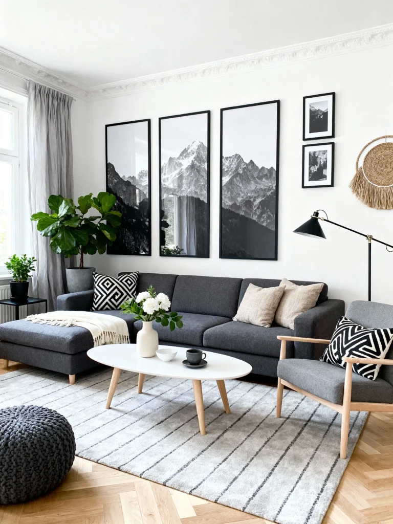 Black, white, and gray don’t have to be boring! This room uses different patterns—like the chevron pillows and the striped rug—to create visual interest without needing bright colors. The triptych (the three-piece art set) of the mountains is such a cool way to fill a long wall over a sectional. It’s clean, it’s organized, and it looks incredibly relaxing. The light wood legs on the furniture keep the “Scandi” vibe strong and fresh.
