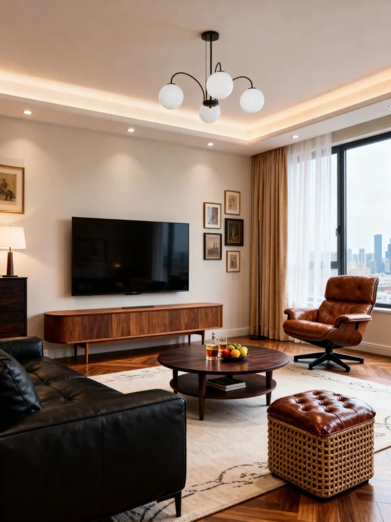 This is the ultimate “grown-up” living room. If you’ve ever dreamed of having a space that feels like a high-end hotel suite but with way more personality, this is it. The star of the show is definitely that leather lounge chair—it’s such an iconic silhouette. It just screams, “I have my life together.”