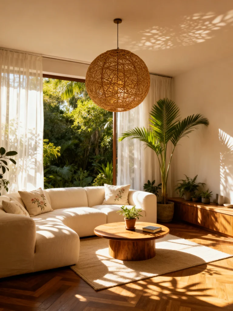 We have image, which is basically a dream sequence. The way the sunlight is filtering through the trees and hitting that white curved sofa is just magical. It feels like a tropical getaway in the middle of a house.