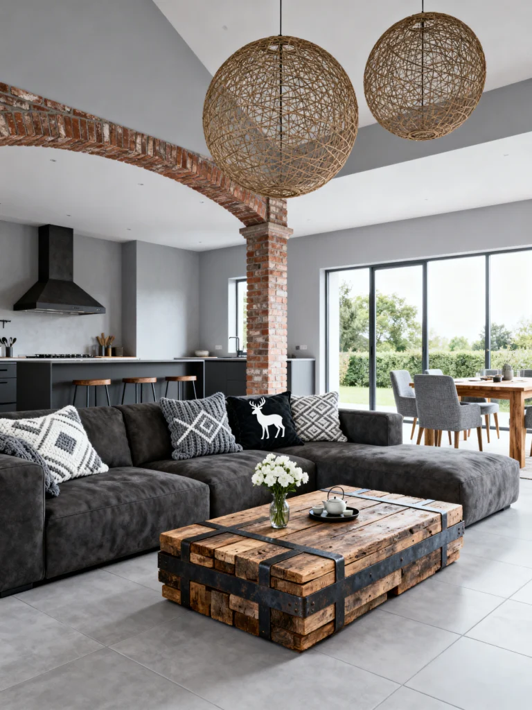 Okay, if you’ve ever dreamt of living in a converted warehouse but still wanted it to feel like a “home,” this is the vibe. I love how this space isn’t afraid to be a little bit “raw.” Look at that incredible brick archway—it adds so much architectural character. Usually, brick and grey concrete floors can feel a bit cold, but the way this is styled makes it feel super sophisticated.