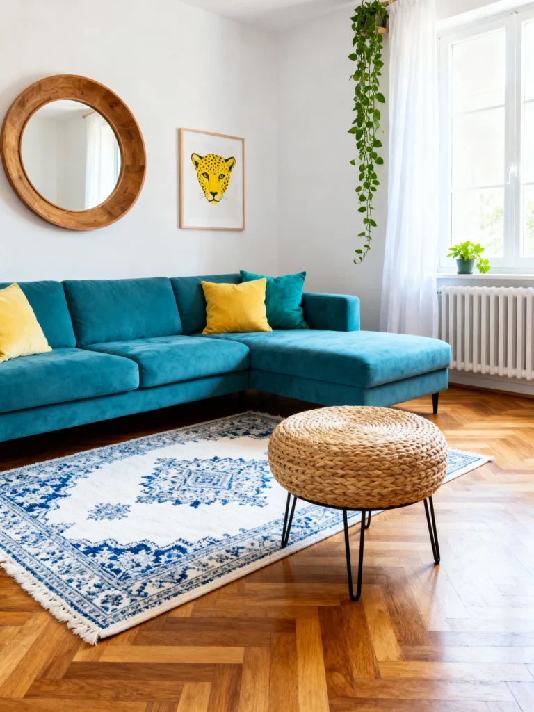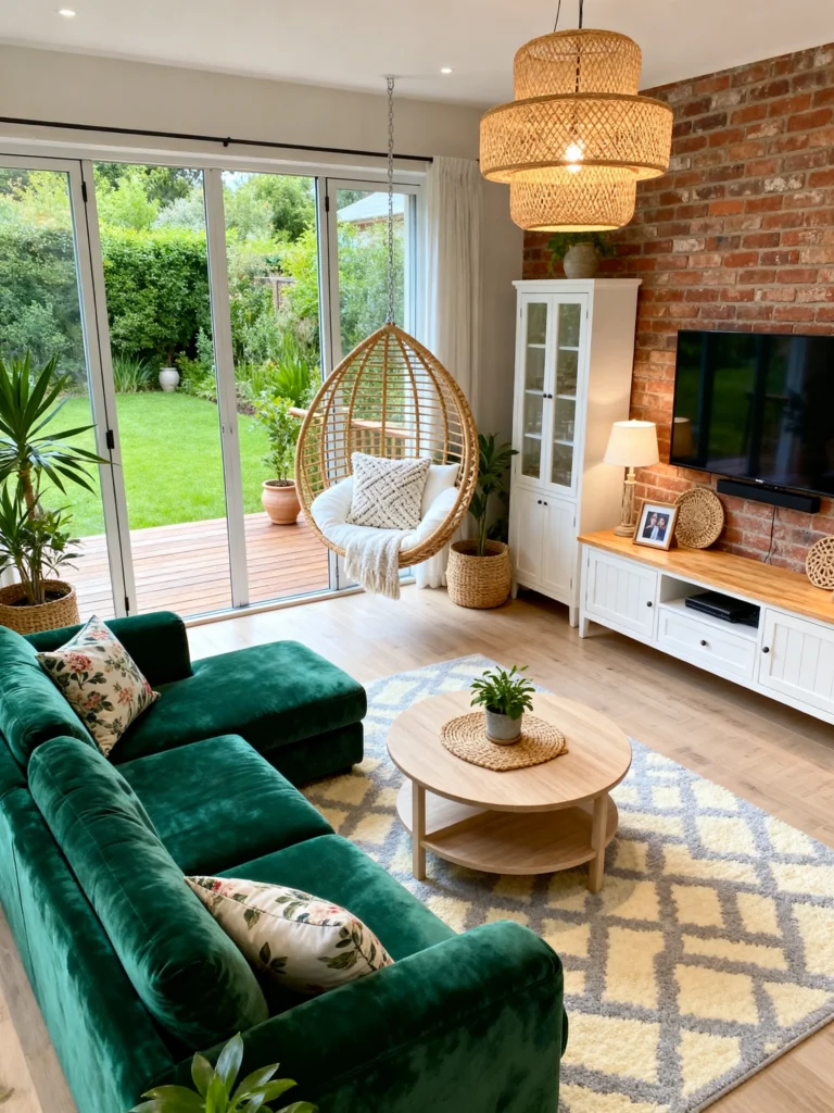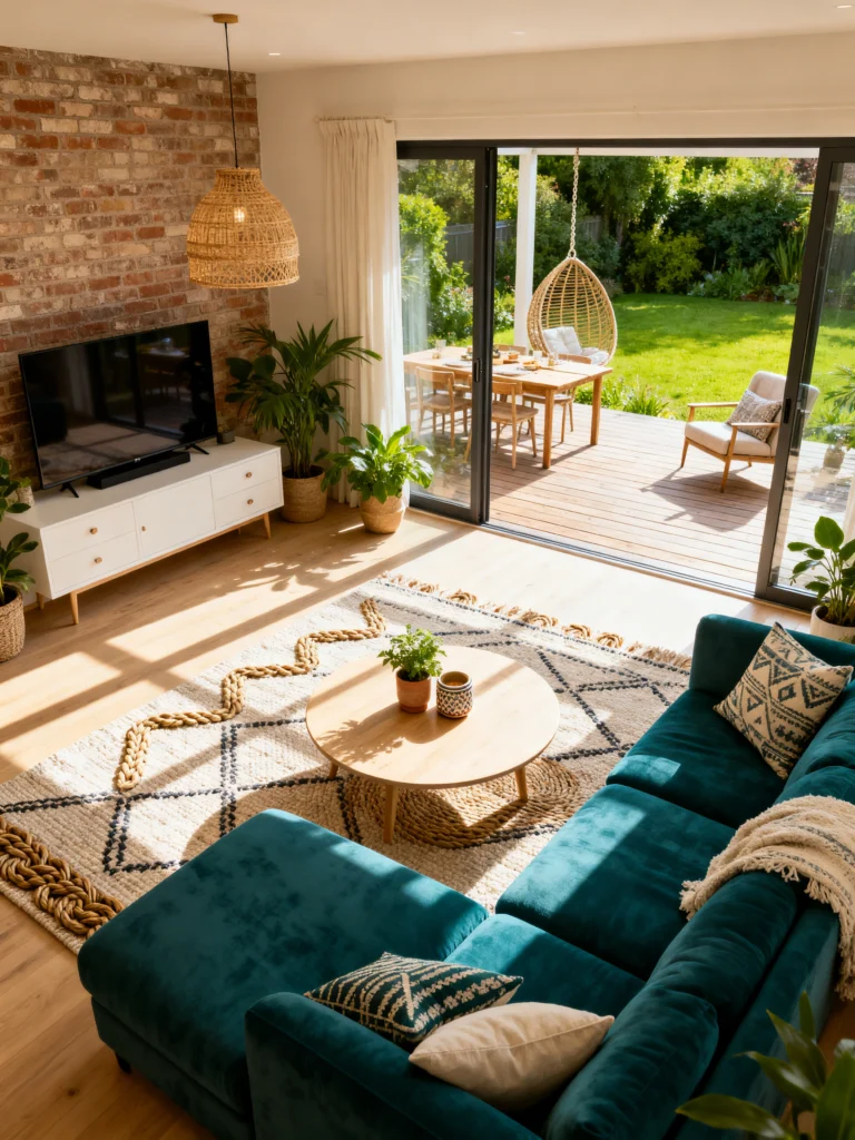 Is it a living room or a garden? Honestly, it’s the best of both. I am absolutely head-over-heels for that deep teal velvet sofa. It’s such a bold choice, but because the rest of the room is so bright and natural, it just looks like a jewel sitting in the sun. And look at that rug! The thick, braided tassels give it so much texture—you just know it feels amazing under your feet.