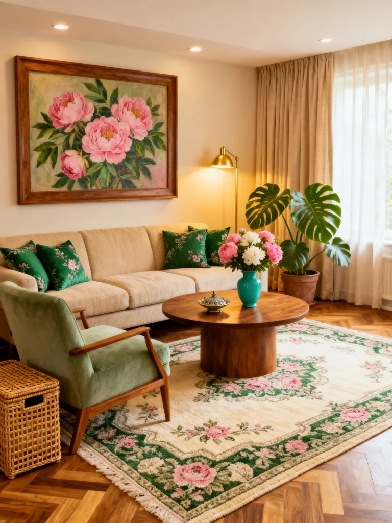 The furniture here is such a great mix of eras. You’ve got a very clean, mid-century modern green armchair and a round walnut coffee table, but then you have that traditional, ornate rug that feels like it has a story to tell. It shouldn’t work together, but it totally does because the colors are so cohesive.