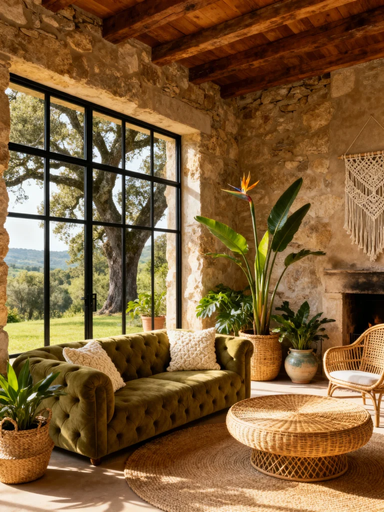 I really like how the decor stays very earthy. The wicker coffee table, the macramé wall hanging, and the various terracotta pots make it feel very grounded. It’s very “boho-meets-ancient-architecture.” And look at that Bird of Paradise plant! It’s huge and adds a pop of tropical orange that looks amazing against the neutral stone.