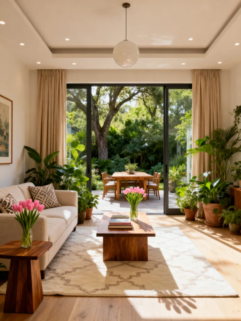 Inside, the palette is so soft and inviting. You’ve got those pops of bright pink tulips that just sing against the cream sofa and light wood floors. It’s a great reminder that you don’t need a ton of color to make a room feel vibrant—just a few well-placed plants and flowers do the trick. The way the light hits the rug and the coffee table makes the whole room feel warm and hazy. It’s the kind of place where you’d actually want to hang out all day, moving from the sofa to that gorgeous outdoor dining table once the sun starts to set. It’s proof that “bringing the outdoors in” isn’t just a cliché; it’s a lifestyle.