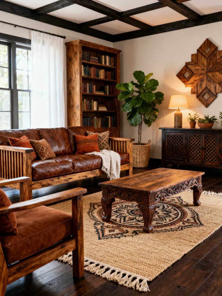 The furniture here is really substantial. That carved wooden coffee table is a total statement piece; it looks like something you’d find in a high-end bazaar. And the leather sofa with the wooden frame? It’s a nice departure from the fully upholstered ones we usually see. It feels sturdy and timeless. I also love the layering of the rugs here—putting a patterned rug over a jute base is such a pro move for adding texture. This is the kind of room where you’d want to curl up with a thick book and a blanket while it rains outside. It’s warm, it’s textured, and it feels incredibly lived-in.