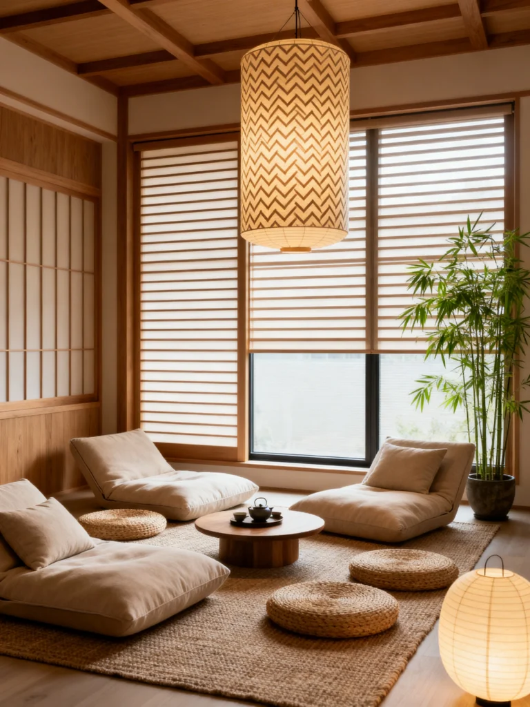 The shoji-style sliding doors are just stunning—they let in so much soft, diffused light. And the bonsai tree in the corner? That’s the perfect “living art” piece for this space. It’s all about bringing nature inside in a very disciplined, beautiful way. Even the wall decor—that circular woven piece—feels like a symbol of balance.