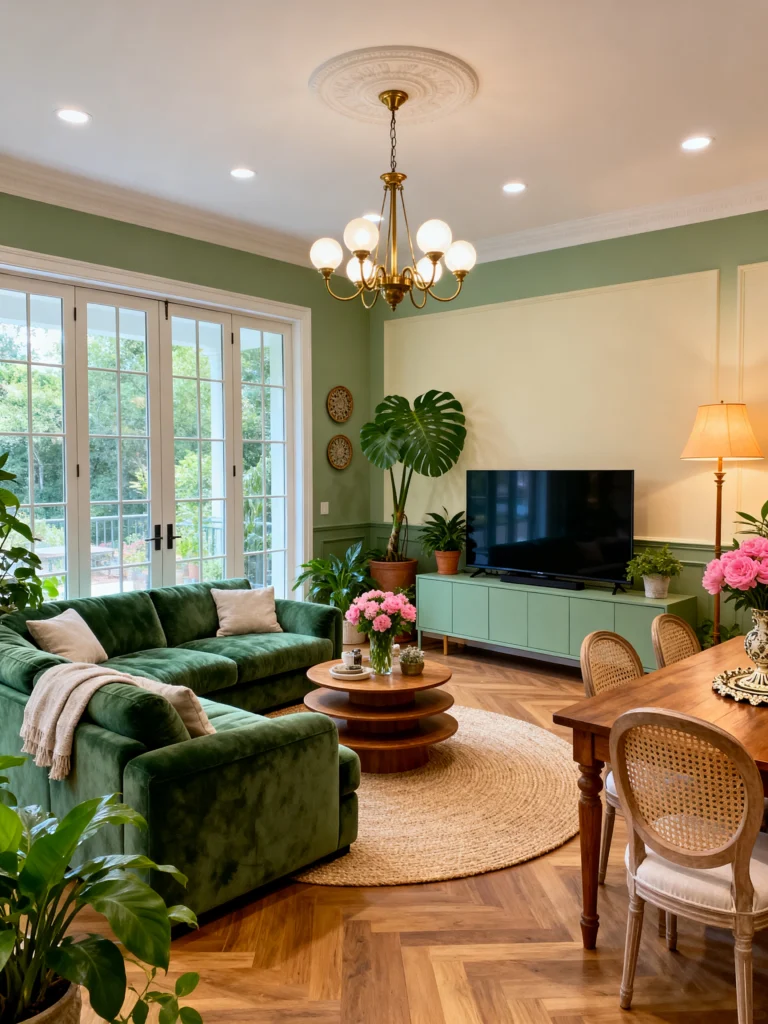 This room feels very “styled” but in a way that’s still cozy. You’ve got the classic wainscoting on the walls, a gorgeous brass chandelier, and a mix of different wood tones between the dining table and the coffee table. It feels like a mix of old-world charm and modern comfort. I love how they’ve used plants and pink flowers to break up all that green. It’s a very social room; you can imagine people lounging on the sofa while others are chatting at the dining table. It’s sophisticated, slightly moody, and very high-fashion.