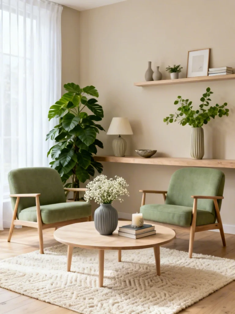 If you’re into the “Japandi” or organic modern look, you’re going to love this. It’s so clean and uncluttered. The pair of sage green armchairs are perfectly symmetrical, which gives the room a very calm, balanced feel. I love that they used two chairs instead of a full sofa here—it makes the room feel more conversational and open.