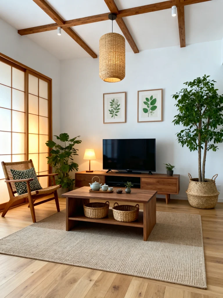 The textures here are what really make it work. You’ve got the woven pendant light, the wicker chair, and those basket-style storage bins under the coffee table. It feels very handcrafted and authentic. I also love the simplicity of the art on the wall—just two botanical prints that bring a bit of nature inside. It’s a very uncluttered space, but the warmth of the wood keeps it from feeling empty. It feels like a very “honest” room, if that makes sense. Nothing is hidden; everything is simple and functional.