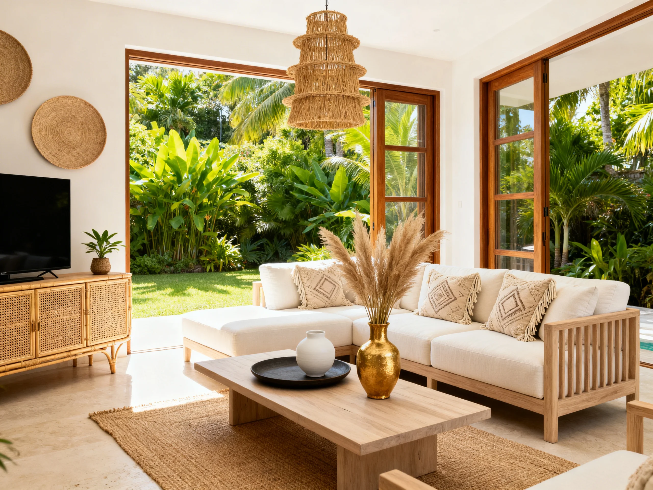 Switching gears completely, is like a breath of fresh air. If the first room was for a nightcap, this one is for a Sunday morning brunch. I am obsessed with how the indoors and outdoors just… melt together. Those massive sliding glass doors open up to a garden that looks like a private sanctuary.
