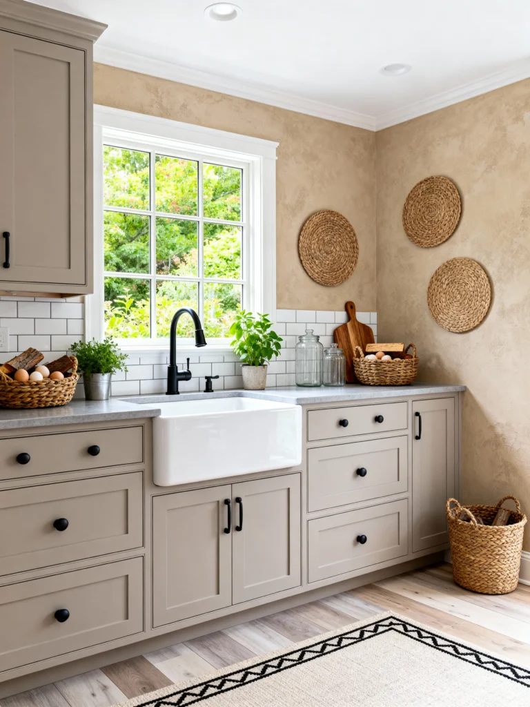 This design feels so grounded and comfortable. The cabinets are a beautiful, warm taupe/greige color, which is a perfect neutral complement to the subtly textured, beige wall. The stark white farmhouse sink, subway tile backsplash, and chunky black hardware create a lovely contrast, giving the space a modern-rustic edge. I love the simple, earthy styling here, too: the woven baskets on the floor and counter, plus the three round woven wall hangings, inject a ton of natural texture and warmth. It’s proof that a smaller kitchen space can still be big on character and style!