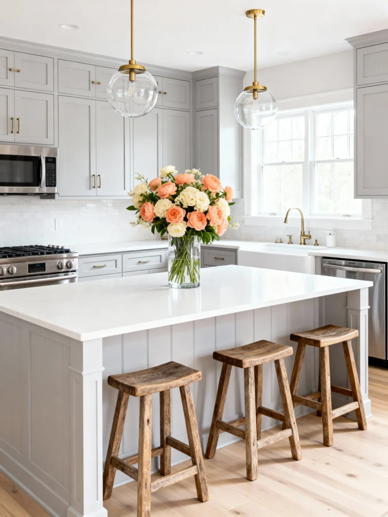 This kitchen is the epitome of airy and bright design! The light gray Shaker-style cabinets are a fantastic neutral base, making the whole room feel fresh and modern. The white subway tile backsplash and crisp white quartz countertop keep the space feeling open and clean. The brass accents on the pendant lights and faucet add a subtle warmth that prevents the gray and white from feeling too cold. I particularly love the island—it has a lovely paneled base and is contrasted by those three rustic, wooden stools, adding a touch of casual, inviting texture. It’s the perfect blend of modern clean lines and cozy materials.