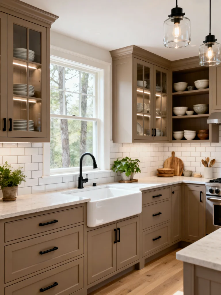If you want a neutral that still feels rich and sophisticated, look no further than this beautiful “greige” color! These cabinets are a wonderful mix of gray and brown, giving them a warm, earthy tone. The dark, matte black hardware provides a striking contrast that feels very modern. The lighted glass upper cabinets are a great feature for displaying dishes, and the large farmhouse sink grounds the entire countertop area. This kitchen successfully uses classic materials—like the white subway tile and marble-look counters—but the unique cabinet color gives it a completely custom and contemporary feel.